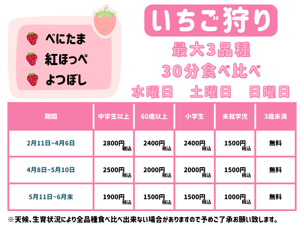 ※ 上記曜日以外で、祝日の場合はいちごの生育状況によって開催する場合がございます。