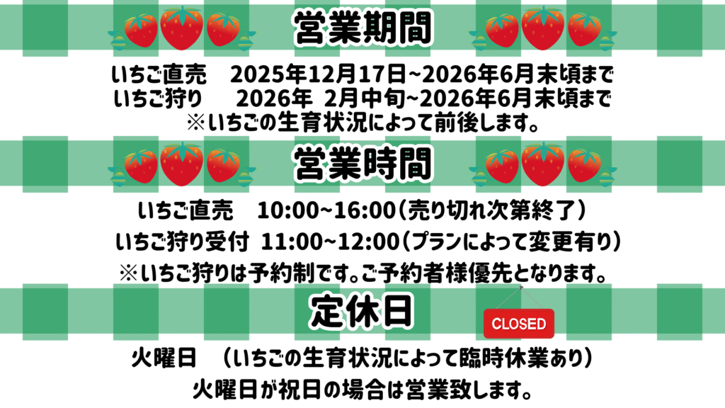 ※祝日の場合はいちごの生育状況によって開催する場合がございます。
